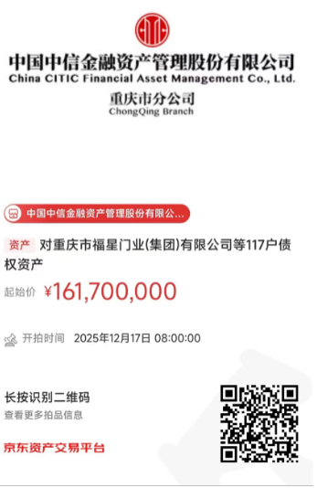 中國中信金融資產(chǎn)管理股份有限公司重慶市分公司(以下簡稱我分公司)擁有對重慶市福星門業(yè)(集團(tuán))有限公司等117戶不良債權(quán)資產(chǎn)。我分公司將于2025年12月17日8:00至2025年12月17日18:00止在京東拍賣網(wǎng)通過公開競價(jià)方式進(jìn)行處置,拍賣鏈接如下圖所示,現(xiàn)再次予以公告。